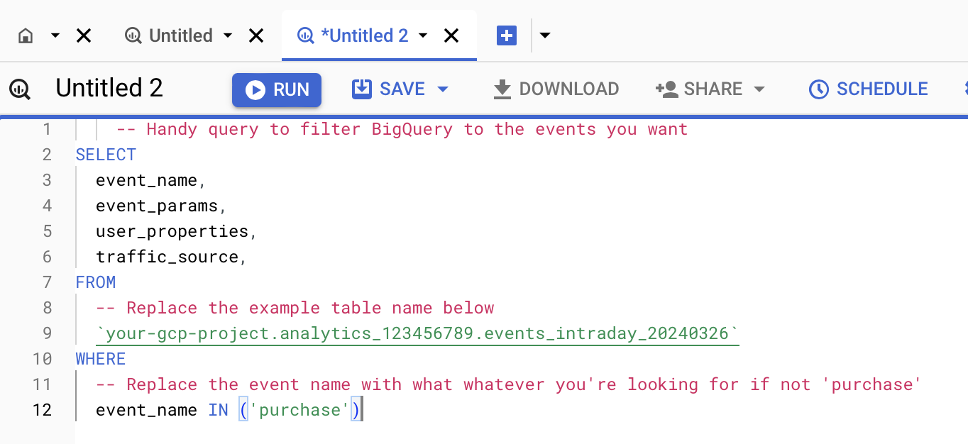 For easy reference, we’ve included the plain text below. The table name should be replaced with your actual table name that is updated with the GCP project, analytics profile ID, and today’s date if querying today’s data. The examples show just the ‘purchase’ event, but any event can be entered. However, if something like “page_view” is queried expect the results to be very long. Similarly with the fields queried; only four are present within the query, but there are many others that can be included.